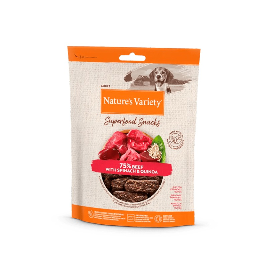 Nature´s Variety superfood buey son barritas elaboradas con mucho mimo al horno con ingredientes muy saludables y naturales para tu perrete como son las espinacas y la quinoa. Sus ingredientes esenciales son los espinacas, vegetal de hoja verde, rica en nutrientes y conocida por su contenido en hierro, y la quinoa, semillas ricas en proteínas y aminoácidos, que les aporta nutrientes a la dieta de tu perro para que su bienestar y salud se vean enriquecidos. Esto lo notarás tanto por dentro como por fuera.